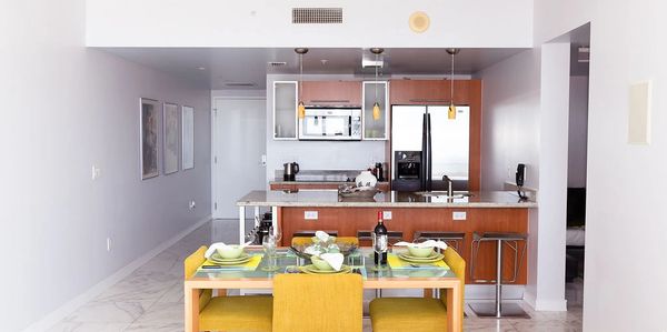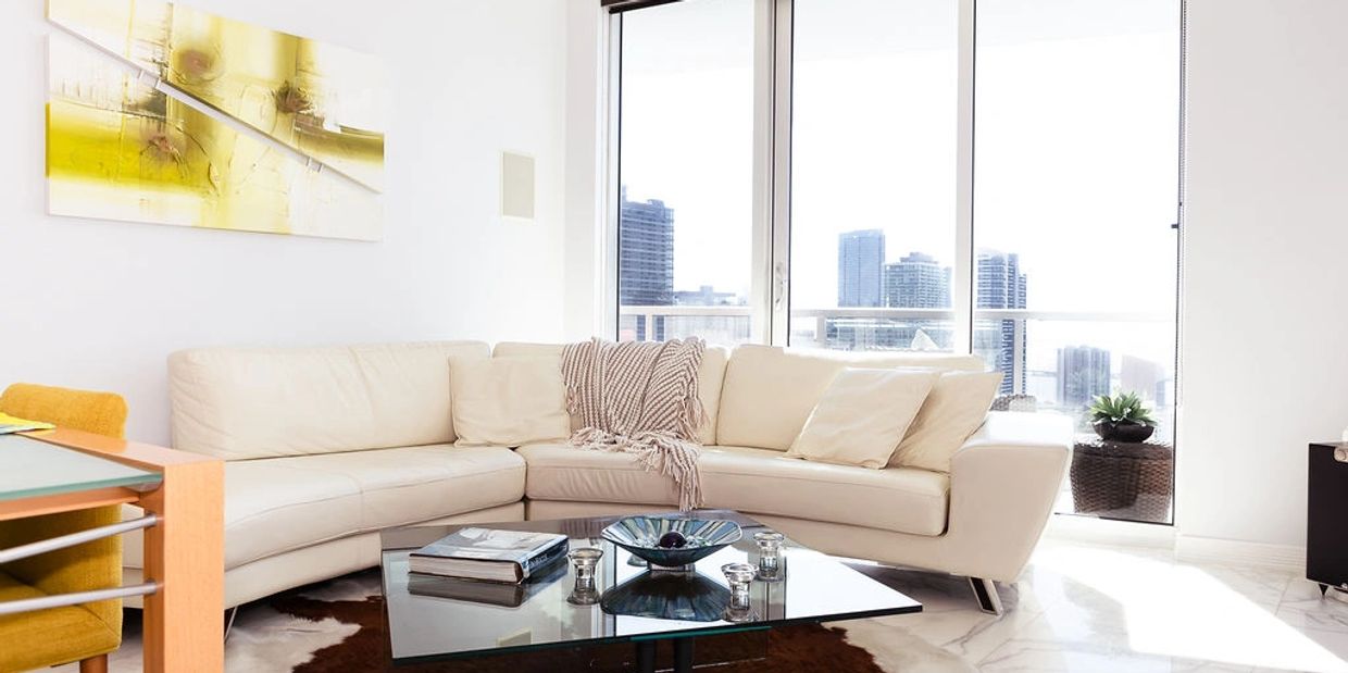 offers a sophisticated living space with unobstructed views of Biscayne Bay, the Miami River, and the Brickell skyline,